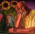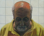 2010Ieder jaar zo ongeveer maak ik tenminste één zelfportret. Het is een soort toetssteen van mijn vorderingen. Het schilderen op doek in praktische formaten geeft mij beperkingen ten aanzien van detail- en oppervlakteweergave. Dit is het eerste werk op masonite, een keihard en glad plaatmateriaal. Een nieuwe ervaring die me goed is bevallen. Aan het eind van de winter inspecteerde ik de tuin en ineens zag ik mijn spiegelbeeld met achtergrond in een van de ramen van ons huis.